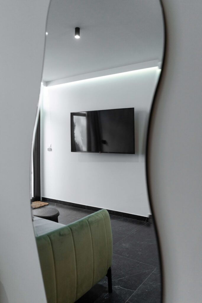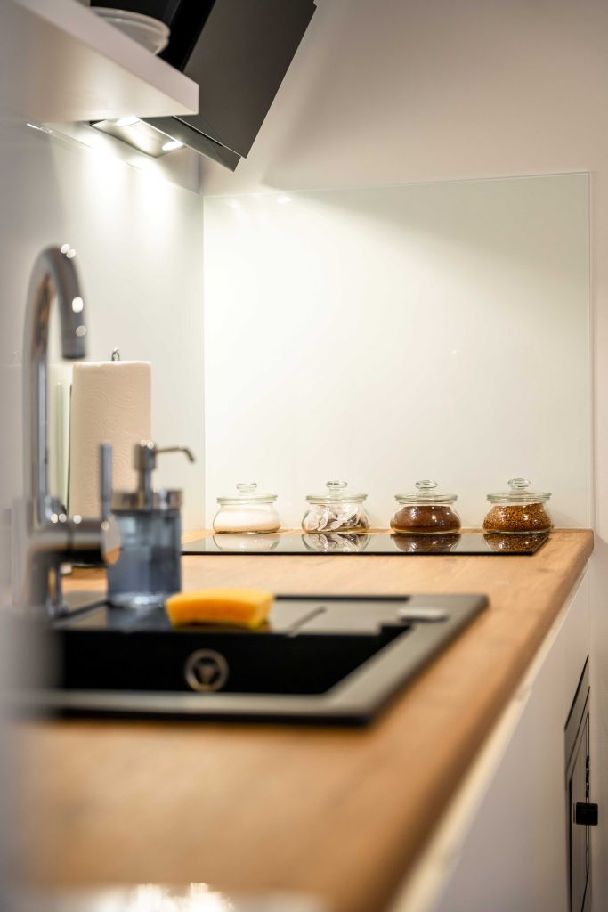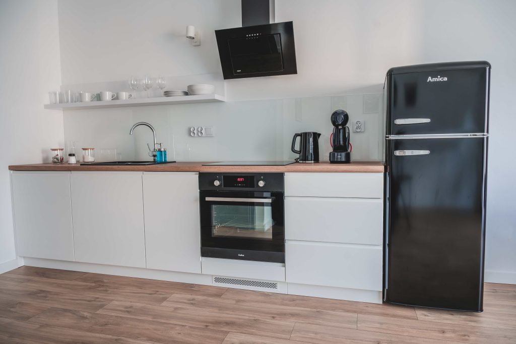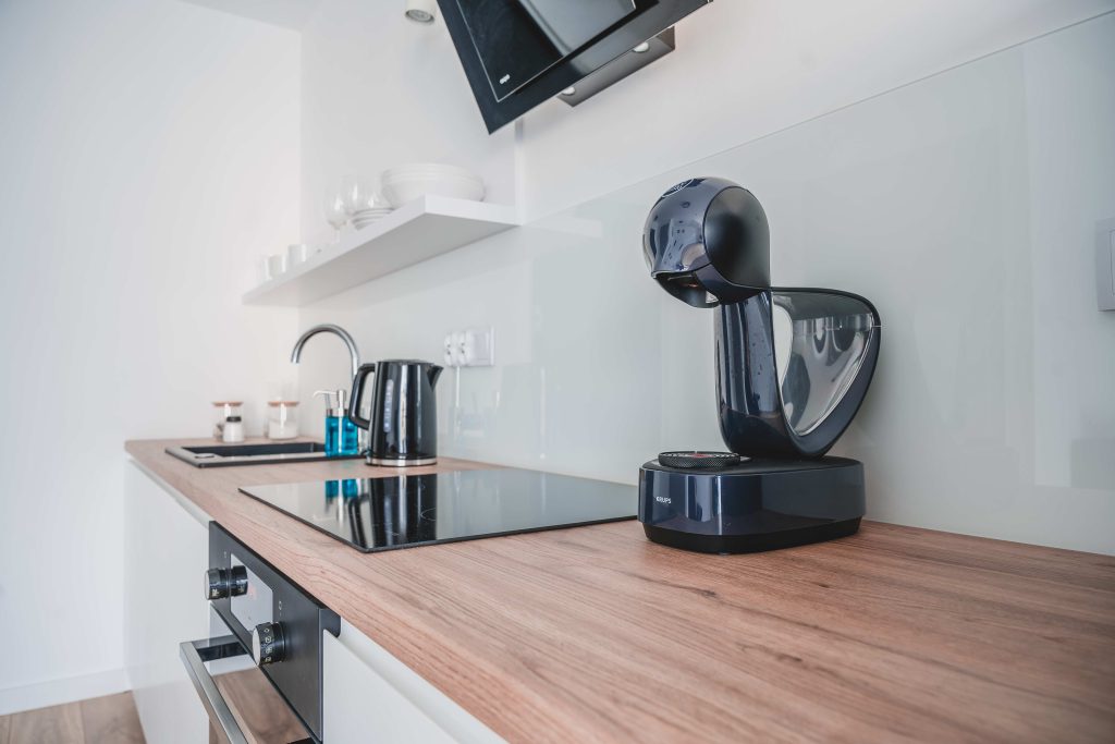 W kuchni znajdziesz ekspres kapsułkowy z powitalnymi kapsułkami kawy, czajnik, mikrofalówkę oraz wszystkie naczynia do przygotowania pysznych posiłków. Dodatkowo oferujemy herbatę, kawę rozpuszczalną i mieloną, a także przyprawy. W łazience czekają świeże ręczniki oraz szampony. Apartament zapewnia również wygodny telewizor ze Smart TV, aby czas spędzony w nim był jeszcze przyjemniejszy. W szafie znajduje się także pudełko z grami, które umilą czas spędzony w apartamencie.
