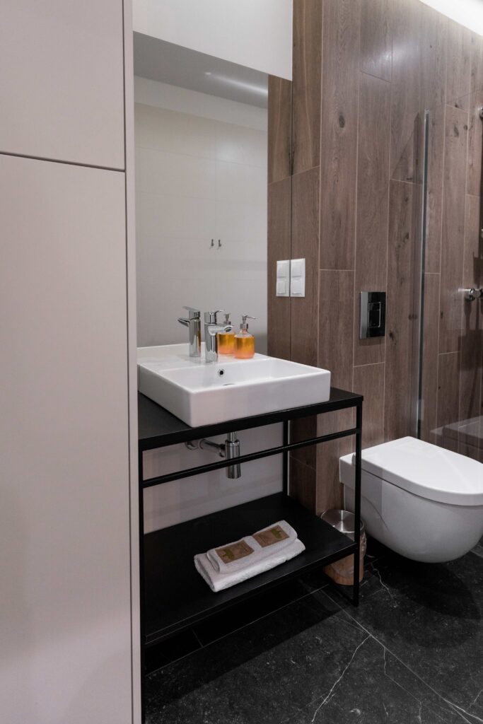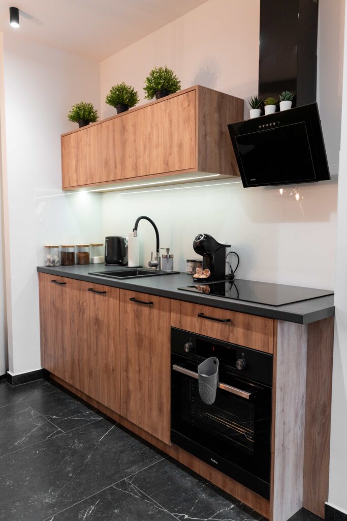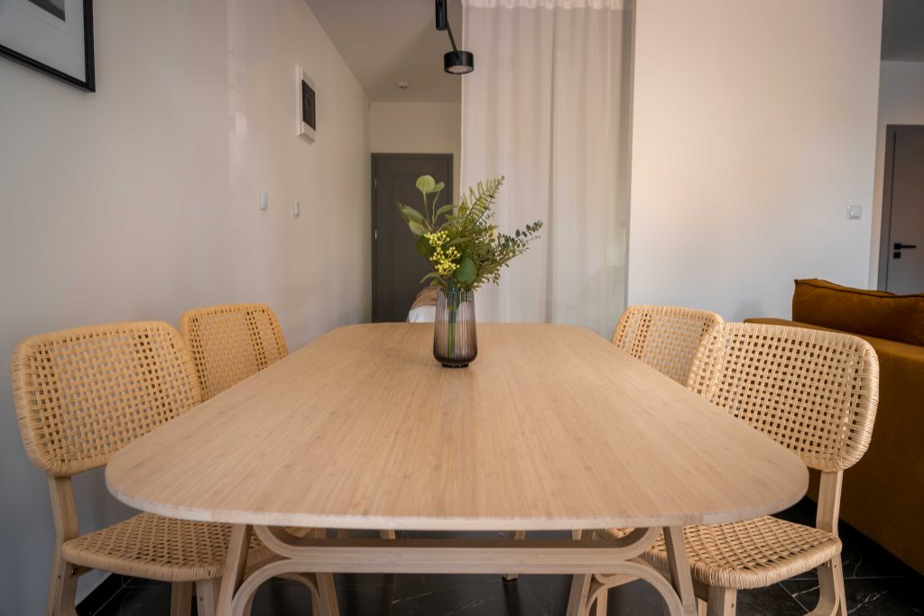 W tym apartamencie poczujesz się jak w domu dzięki przestronnej garderobie, w której wygodnie przechowasz wszystkie swoje rzeczy. W kuchni czeka na Ciebie piekarnik, idealny do przygotowania ulubionych dań. Dodatkowo apartament wyposażony jest w pralkę oraz suszarkę do ubrań, co z pewnością ułatwi długoterminowy pobyt. W trosce o komfort gości, apartament oferuje także wszelkie udogodnienia, takie jak ekspres do kawy i świeże ręczniki w łazience. W szafie znajdziesz także pudełko z grami, które uprzyjemnią wieczory.